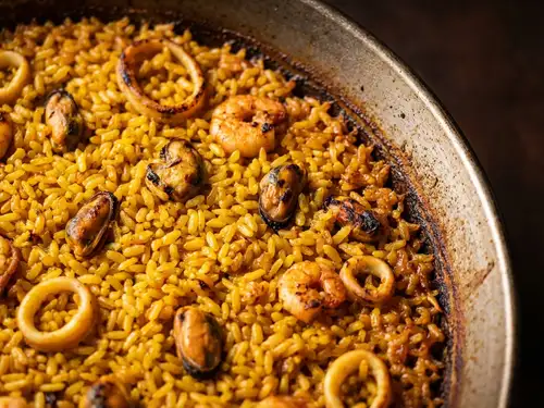 Con marisco fresco del día, para compartir. Arroz en su punto.